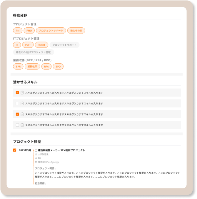我々コンサルティングファームが蓄積する豊富な経験に基づき、書類通過に最適化された機能を提供します。あなたは最適化された項目に情報を入力するだけで、効果的な職務経歴書を簡単に作成することができます。
